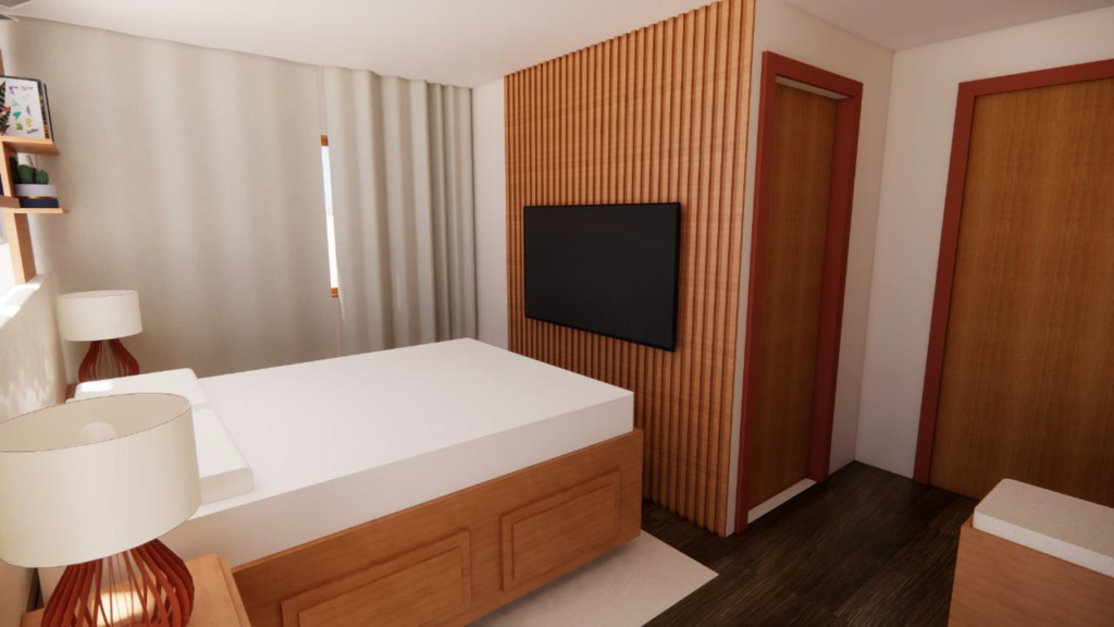 Painel Ripado: O destaque visual fica por conta do painel ripado na cabeceira e na sala. Além da beleza estética, a textura da madeira cria profundidade e sofisticação, tornando o espaço visualmente mais interessante e menos monótono.