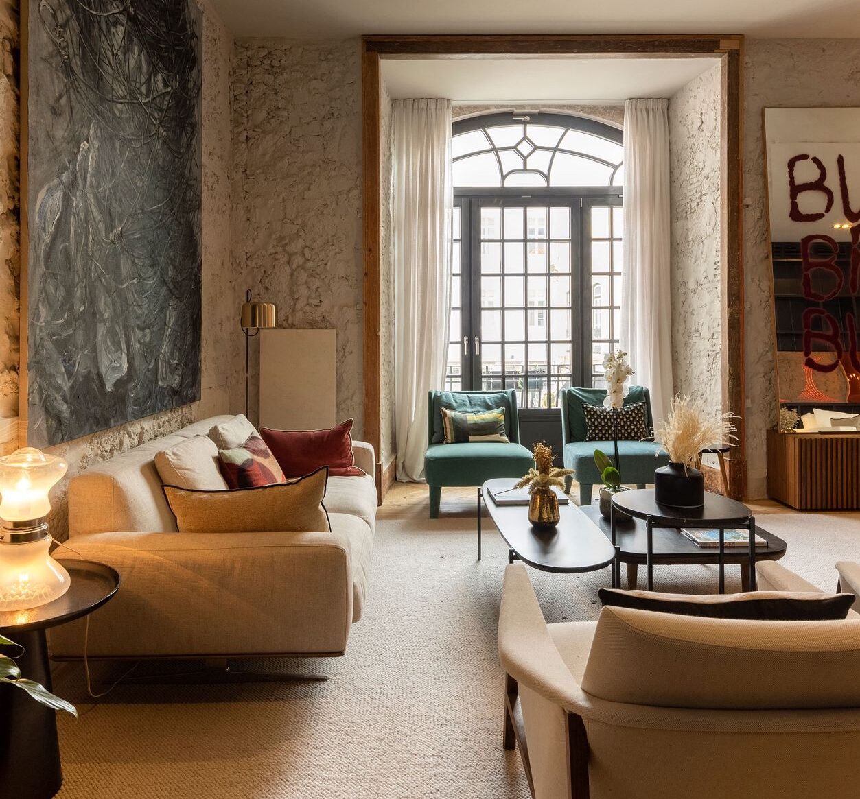 A @afralocation misturou com móveis de madeira e quadros vintage. A parede colorida dá um toque surpreendente a composição.